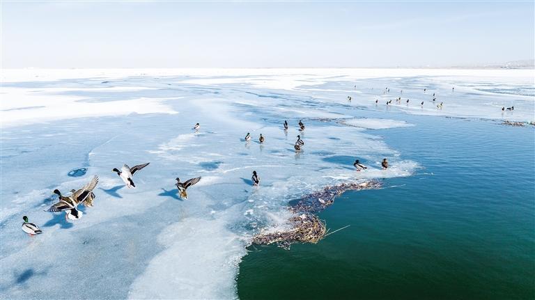 中國甘肅網(wǎng)2月3日訊 據(jù)蘭州晚報報道(通訊員 李永華 魏生明 記者 高慧霞 攝)2月2日,位于金塔縣的解放村水庫,越冬候鳥綠頭鴨、赤麻鴨成群結(jié)隊。隨著金塔縣生態(tài)環(huán)境的持續(xù)改善和好轉(zhuǎn),近幾年過境候鳥數(shù)量持續(xù)升高,每年冬天都有綠頭鴨、赤麻鴨等鳥類遷徙到解放村水庫等濕地越冬。
