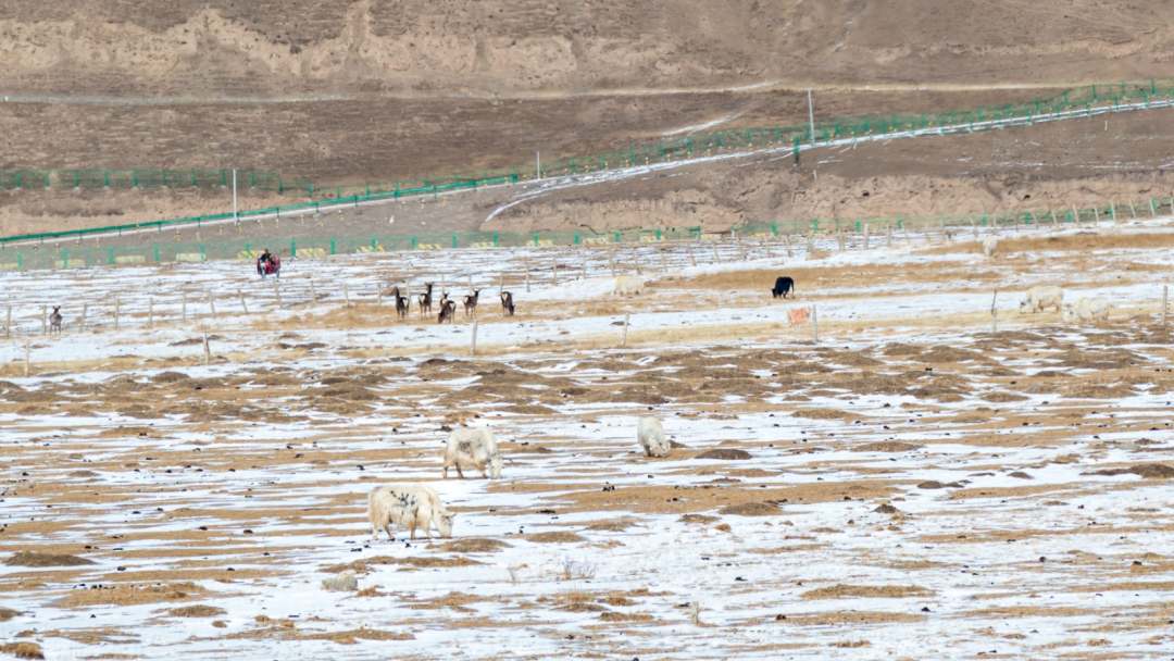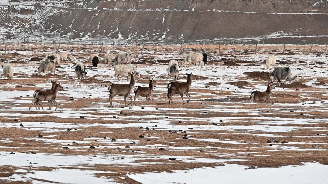 近日,在武威市天祝藏族自治縣抓喜秀龍草原上,野生的狍鹿和牧民家養(yǎng)的白牦牛同食牧草,構成一幅和諧動人的自然圖景。張廷愛攝。