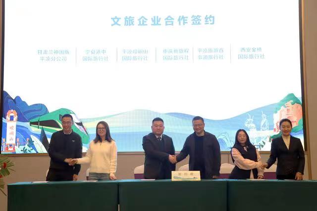 專題推介會上,平?jīng)鍪形幕瘡V電和旅游局推介了全市文旅資源及“引客入平”系列支持政策,崆峒山、大云寺·王母宮、龍泉寺、云崖寺等重點(diǎn)景區(qū)和涇川橙香瑤池溫泉酒店分別作了主題推介。平?jīng)鑫穆猛豆九c西安一帶一路文旅公司、涇川大云恒盛旅游公司與西安黃河國旅、崇信公劉文旅投公司與寶雞春暉旅行社、莊浪關(guān)山文旅投公司與寧夏新文化國旅、崆峒山國旅與重慶新旅程國旅、甘肅蘭神國旅平?jīng)龇止九c寧夏港中國旅、平?jīng)雎糜伟偈峦ㄅc西安金橋國旅等14家省內(nèi)外旅行社分別簽訂“引客入平”客源互送合作協(xié)議。推介環(huán)節(jié)還進(jìn)行了《神仙留戀的好地方》《崆峒武術(shù)魂》《折柳》和《春天的芭蕾》等文藝表演,與會嘉賓參觀了“問道崆峒·養(yǎng)生平?jīng)?rdquo;文旅形象圖片展、文旅產(chǎn)品市集、非遺技藝展示及網(wǎng)絡(luò)直播和非遺文創(chuàng)產(chǎn)品展。甘肅省文旅廳有關(guān)處室、各相關(guān)市州文旅部門負(fù)責(zé)人和省內(nèi)外旅行商、文旅企業(yè)、媒體記者代表,平?jīng)鍪兄攸c(diǎn)景區(qū)、文旅投公司、文創(chuàng)企業(yè)代表共150余人參加。