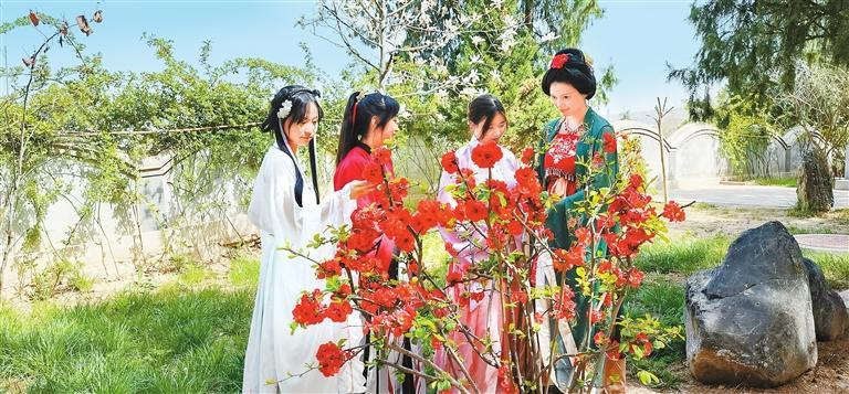 據介紹,本次活動以“啟·百花之春、賞·漢服之美、禮·花神之祀、觀·非遺之趣”四大主題貫穿始終。當天13時40分許,記者來到天水市玉泉觀大景區(qū)時遠遠看到,從玉泉觀“牌坊”自下拾階而上的地方,到處都是“同袍”們飄逸灑脫、仙味十足的身影。她們三五一群躑躅前行,即便互不相識,此刻只要相視一笑,也能心領神會。身著漢服置身千年古觀,瞬間,古樹紅墻旁、古建玉泉邊頓生穿越之感,渾然一體。