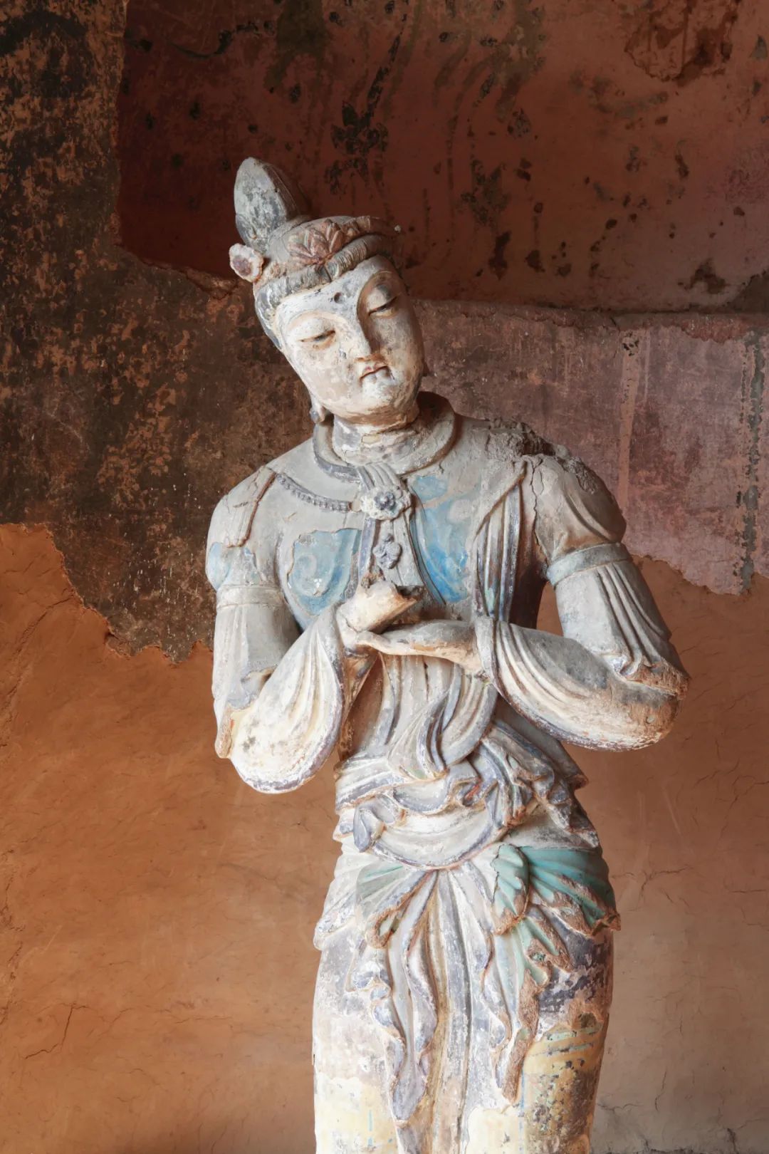這一時(shí)期造像最杰出的代表是隋代開鑿的東崖大佛(第13窟),為石胎泥塑,正中主尊系阿彌陀佛,左、右分別為觀世音和大勢至菩薩,大佛高15.7米,氣勢宏偉,也是麥積山第一大佛。造像風(fēng)格上,體態(tài)豐腴,神情雍容大度,服飾繁縟華貴,充分展現(xiàn)出隋唐王朝的盛世風(fēng)貌。但由于地震、戰(zhàn)亂等自然和人為因素影響,盛唐以后的麥積山走向了衰敗。