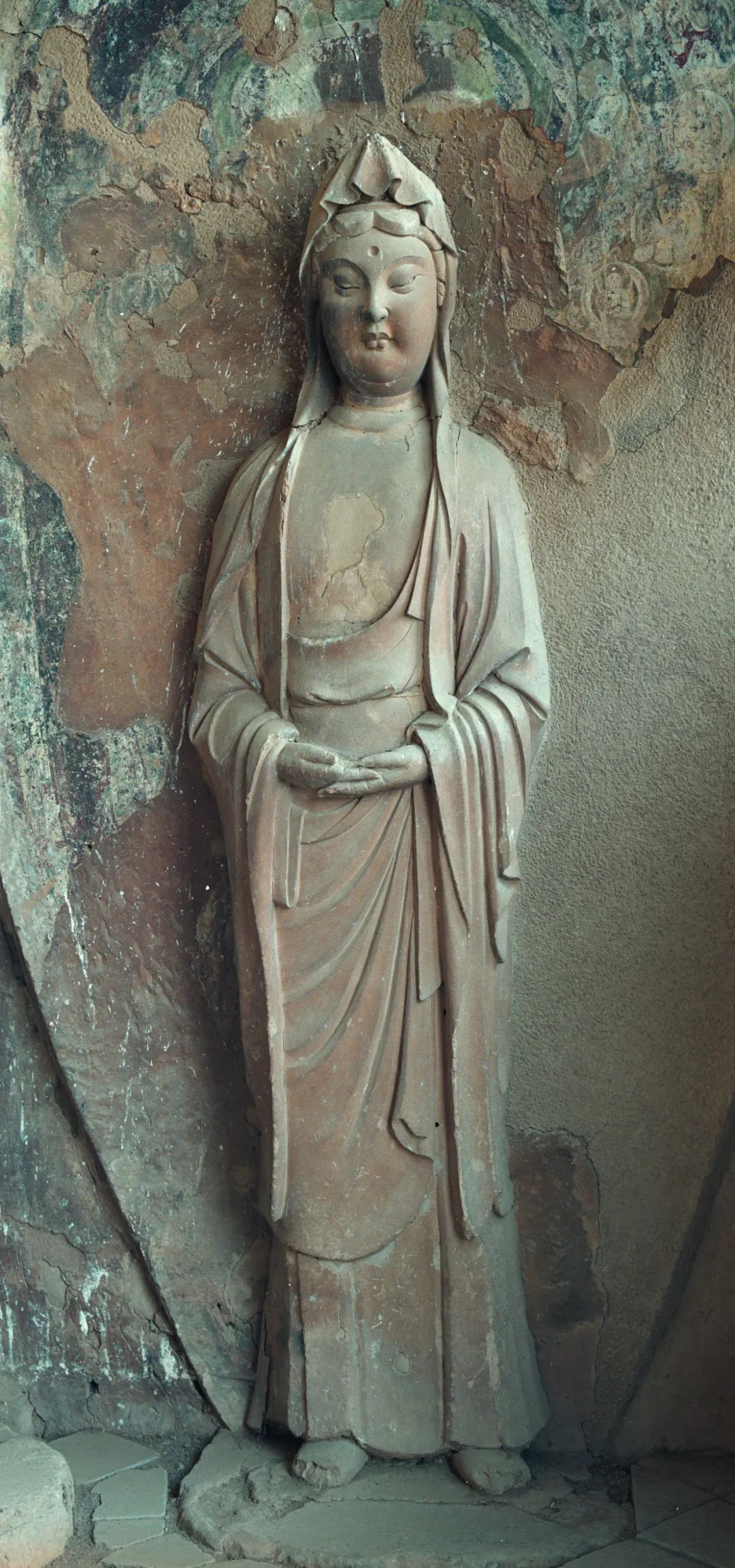 從題材上看,以單尊佛、菩薩、力士等為主,風(fēng)格上更具有寫實(shí)性。造像面相橢圓飽滿,斜眉吊目,懸鼻小口,表情森嚴(yán)、凝重,服飾簡潔、質(zhì)樸,寬博厚重,極富質(zhì)感。其中佛低平螺髻,前置肉髻珠,身穿垂領(lǐng)袈裟。菩薩束發(fā)高髻或戴風(fēng)帽,眉目慈祥,身材比例協(xié)調(diào)、準(zhǔn)確。力士表情生動(dòng)傳神,體形孔武雄健,充滿陽剛之氣,給人以強(qiáng)烈的力量和威武感;這段時(shí)間造像前衰后盛也與當(dāng)時(shí)秦州所處環(huán)境有密切關(guān)系。