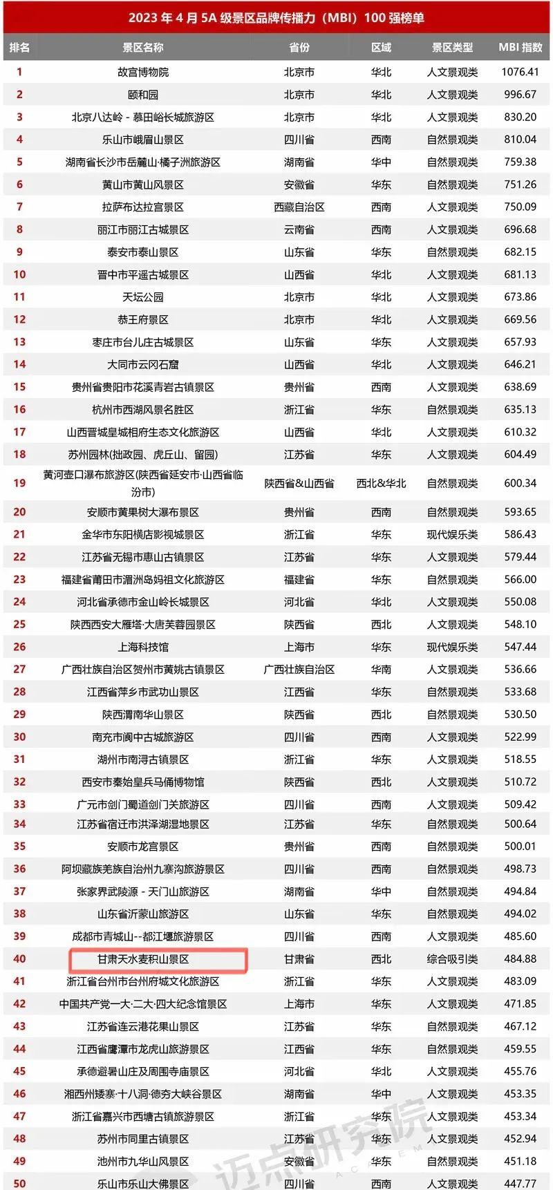 2023年4月5A級景區(qū)品牌傳播力100強榜單上,熱烈祝賀麥積山景區(qū)榮登國內(nèi)文旅行業(yè)最具影響力的權(quán)威數(shù)據(jù)分析機構(gòu)“邁點研究院”4月5A級旅游景區(qū)品牌傳播力百強榜單前五十和綜合類旅游景區(qū)第一、西北地區(qū)分項榜單第五。