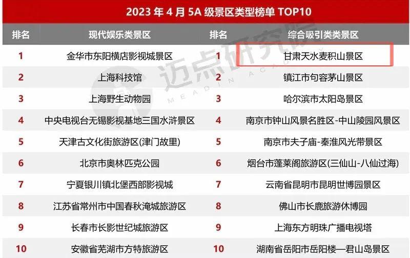 最新5A級景區(qū)百強出爐!麥積山大景區(qū)上榜!