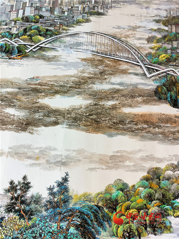 李建春,黃河上的橋梁也是他構思畫面的重要部分,從小西湖出發(fā),有小西湖黃河大橋,中山橋,元通大橋,城關黃河大橋,金雁黃河大橋等各有特色的橋梁,但是畫的多了畫面被割裂,畫的少了有顯示不出來黃河的人文景觀,最后他畫了中山橋和金雁黃河大橋,就像畫框一樣圈住了城市的風景。