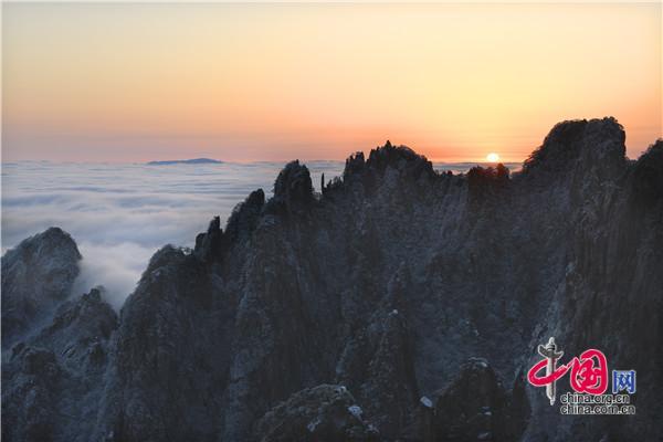 原標(biāo)題:只有一個(gè)黃山:雪后日出、云海同現(xiàn) 美輪美奐