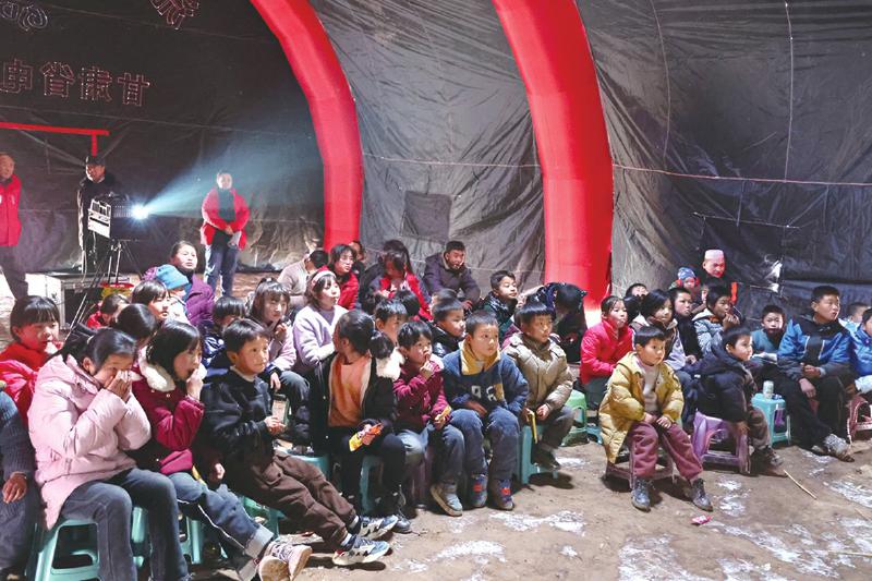 冬日的嚴(yán)寒擋不住震區(qū)群眾的觀影熱情。帳篷內(nèi),電影《英雄若蘭》《新神榜:楊戩》先后放映,孩子們分排而坐,被影片生動(dòng)有趣、跌宕起伏的情節(jié)深深吸引,不時(shí)傳出歡聲笑語。“志愿者給我們放電影,豐富了我們的文化生活。”正在觀影的村民呂鵬說。