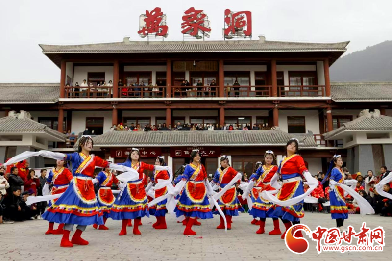 2024年2月21日,在甘肅省隴南市國(guó)家AAAA級(jí)景區(qū)——武都區(qū)萬象洞風(fēng)景名勝區(qū),當(dāng)?shù)厝罕娊M織的社火表演隊(duì)正在演出。