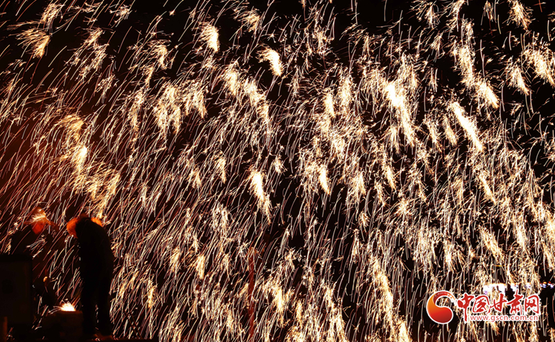 10月5日晚,位于甘肅省張掖市甘州區(qū)的玉水苑生態(tài)景區(qū)內(nèi),非遺傳承人在為游客和市民表演國家級非遺項(xiàng)目打鐵花。(王將 攝)