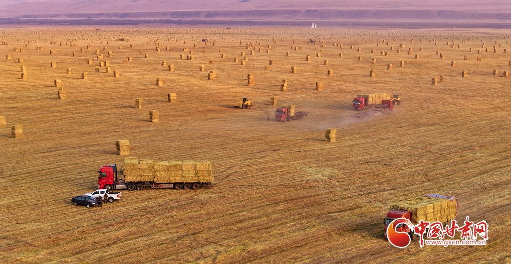 11月11日,甘肅山丹馬場的10萬畝燕麥草進入打包高峰期,田野上呈現(xiàn)出一派繁忙而有序的景象。放眼田間,大型農(nóng)用機械來回穿梭,將燕麥草迅速壓縮、打包,一個個草捆整齊排列。與此同時,滿載草捆的運輸車在田間小道上來回奔波,將成品送往倉庫和銷售地。