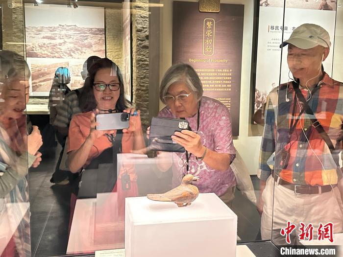 圖為游客在參觀彩繪漆木鳩。 戴文昌 攝