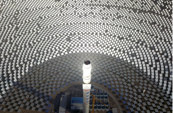 人們驚呼,這是自然力與人類智慧的完美創(chuàng)造:戈壁荒灘上“種”出了人造太陽。這個100兆瓦熔鹽塔式光熱電站,占地面積相當(dāng)于780個足球場,每年所生產(chǎn)的綠電可減排35萬噸二氧化碳。