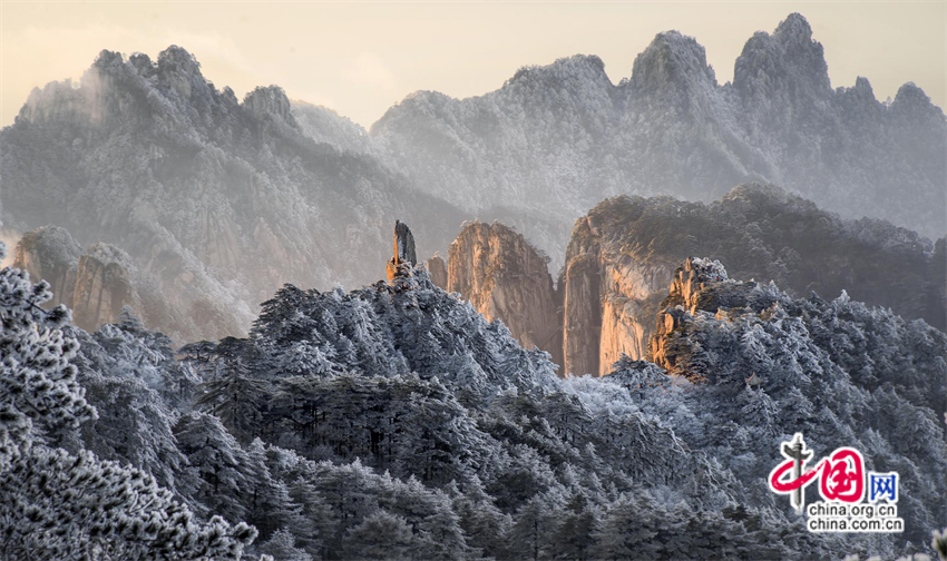 11月25日夜,安徽黃山風(fēng)景區(qū)迎來(lái)入冬首場(chǎng)降雪。26日,雪后初霽,五百里黃山銀裝素裹、分外妖嬈。山峰、奇松、怪石在朝陽(yáng)的關(guān)愛(ài)下披上了一層金色的外衣。松林相間雪花層疊,熠熠生輝,翠色與銀白交織,宛如瓊枝玉樹(shù),讓人流連忘返。