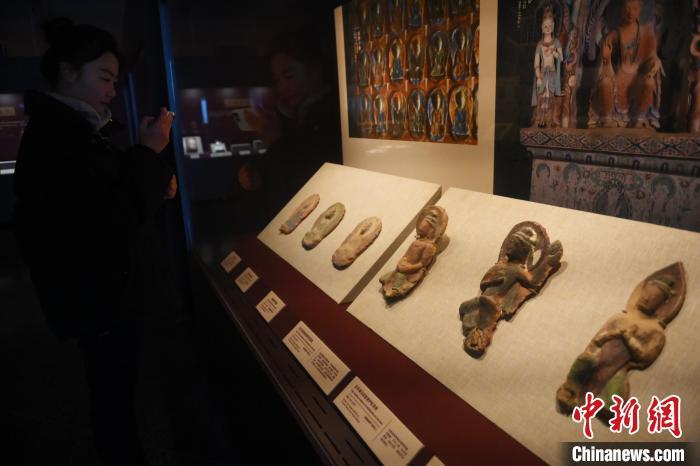 11月28日,甘肅省敦煌市,敦煌研究院敦煌石窟文物保護(hù)研究陳列中心,游客拍攝《披沙揀金——敦煌研究院館藏文物擷英展》。該展由敦煌研究院主辦,2024年下半年煥新布展,展出了不同類型館藏文物,通過這些文物蘊含的豐富歷史信息,展現(xiàn)了敦煌文化的多元與包容,勾勒不同文明偕行共進(jìn)的歷史脈絡(luò)。中新社記者 李亞龍 攝