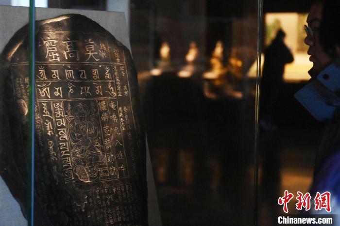 11月28日,甘肅省敦煌市,敦煌研究院敦煌石窟文物保護(hù)研究陳列中心,游人參觀《披沙揀金——敦煌研究院館藏文物擷英展》中的碑刻。該展由敦煌研究院主辦,2024年下半年煥新布展,展出了不同類型館藏文物,通過這些文物蘊含的豐富歷史信息,展現(xiàn)了敦煌文化的多元與包容,勾勒不同文明偕行共進(jìn)的歷史脈絡(luò)。中新社記者 李亞龍 攝