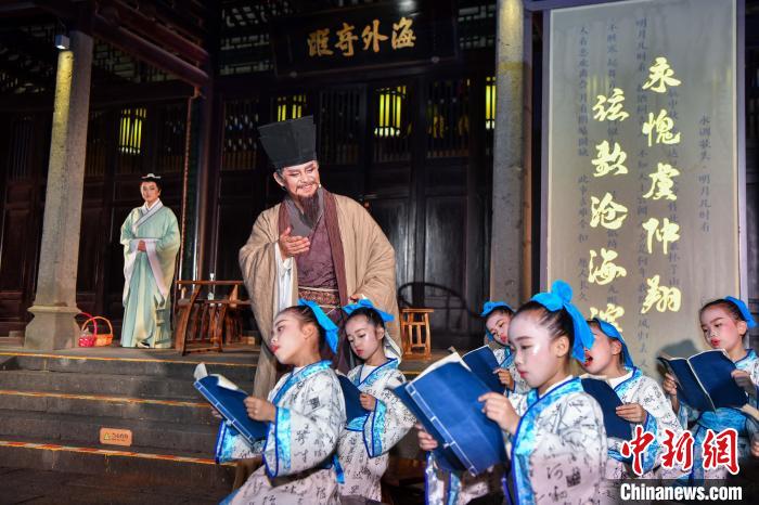 春工湖上,輕舟搖曳,昌化軍使張中扮演者吟詩(shī)而來(lái),在書院正門前迎候游人;叩門三聲,鼓樂(lè)齊鳴,書院大門開(kāi)啟,一場(chǎng)“穿越”到宋朝的沉浸演出就此展開(kāi)。