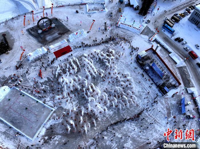 當(dāng)日,北極村七星廣場(chǎng)上,身披紅斗篷、頭戴紅帽子的游客和當(dāng)?shù)鼐用窠M成一個(gè)巨大的“53°”造型。伴隨著激情澎湃的音樂,他們擺好姿勢(shì),將手中熱水奮力一灑,齊聲高喊“極致興安嶺 潑出好風(fēng)景”,一道道劃破天際的弧線,碰撞出的神奇光影。震撼的場(chǎng)面讓現(xiàn)場(chǎng)游客驚呼不已,他們紛紛舉起手機(jī)定格這個(gè)精彩瞬間。