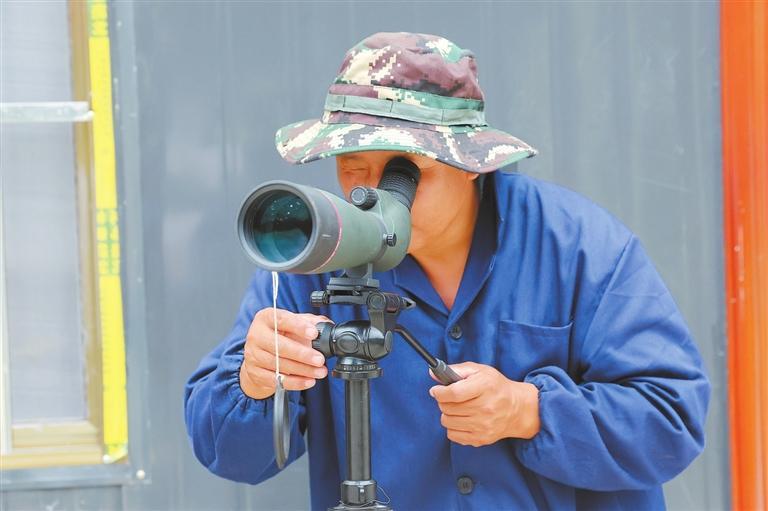 宋治平通過單筒望遠(yuǎn)鏡觀察朱鹮。 新甘肅·甘肅日報(bào)記者 馮樂凱