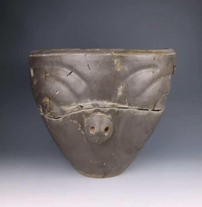 然而,馬家窯人的藝術(shù)創(chuàng)造力似乎遠(yuǎn)不止于此。寺洼遺址新出土的眾多陶器展現(xiàn)出全新的造型與紋飾風(fēng)格。如其中一件帶有“豬鼻”的馬家窯類型泥質(zhì)灰陶,色澤深沉灰黑如夜,一只鼻子自陶胎中緩緩隆起,上方的弧形紋理像舒展的眉骨,又像張開的羽翼,一場古文明的夢境由此展開。