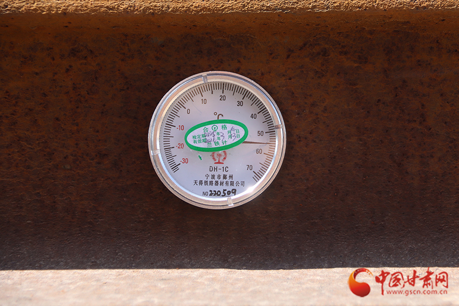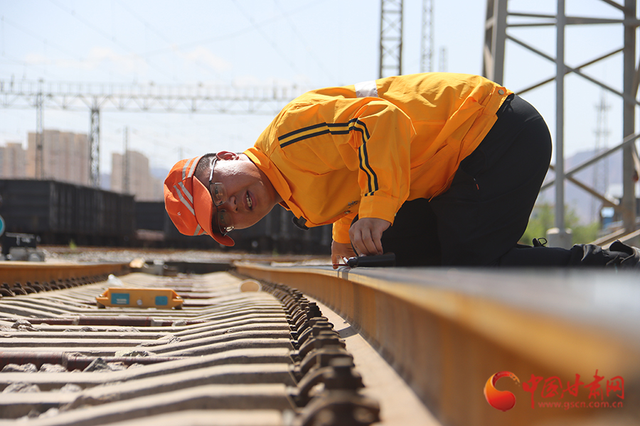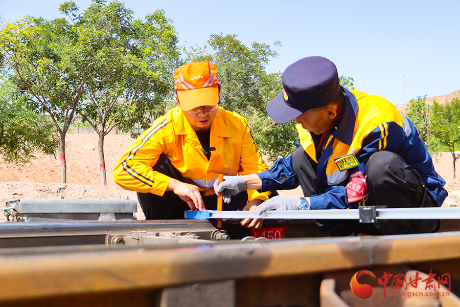 “樊工長,測一下此時(shí)的軌溫是多少?”到達(dá)蘭州北編組站下行到達(dá)場后,劉亞雄一邊擦拭著額頭不斷滾落的汗珠,一邊向樊勇喊道。樊勇熟練地將軌溫計(jì)貼在軌腰上,金屬表盤上的指針猶如上了發(fā)條,瞬間直飚半圈定格在54℃!