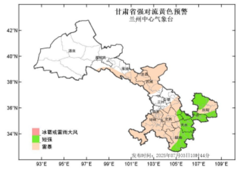 蘭州中心氣象臺2025年7月3日10時44分繼續(xù)發(fā)布強(qiáng)對流黃色預(yù)警:預(yù)計未來24小時,張掖、金昌、武威、蘭州、白銀、甘南、臨夏、定西、隴南、天水、平?jīng)?、慶陽等州市有雷暴,其中隴南、天水、平?jīng)觥c陽等市部分地方及白銀、定西兩市局部地方有短時強(qiáng)降水,最大小時雨強(qiáng)20-60mm;隴南、天水、平?jīng)觥c陽等市強(qiáng)降水在未來24小時內(nèi)多發(fā),白銀、定西主要強(qiáng)降水時段在4日2-8時。請注意防范!