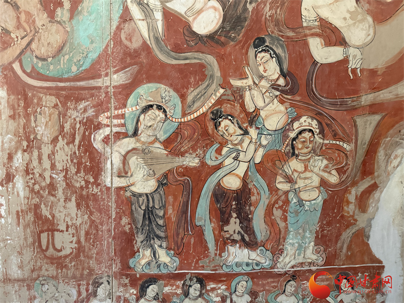 莫高窟第220窟,胡旋舞者翩翩起舞,頭發(fā)都甩了起來(lái),飄帶更是在旋轉(zhuǎn)中絲滑無(wú)比,雖然是靜態(tài)壁畫(huà),卻傳遞著無(wú)處不動(dòng)的舞者既視感。