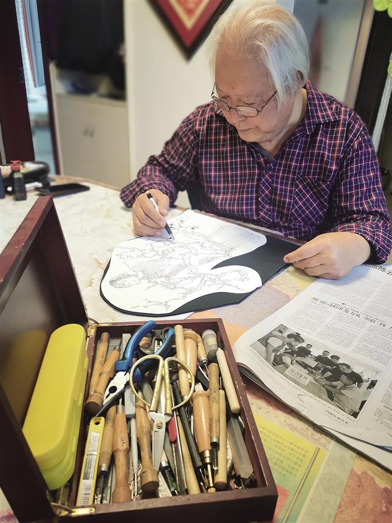 談到創(chuàng)作過程,他眼神中閃爍著匠人的嚴謹光芒:“剪一個好作品,首先要有一個構(gòu)思,然后再把它畫出來,再去動剪刀、刻刀各種工具。” 在他這里,剪紙絕非簡單的“剪花樣”,而是嚴謹?shù)乃囆g(shù)創(chuàng)作,是“胸有成竹”后的“運剪如風(fēng)”。