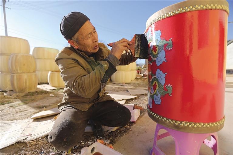 冬日農(nóng)閑時(shí)節(jié),在甘肅省定西市安定區(qū)鳳翔鎮(zhèn)北廿鋪村,牛皮鼓手工制作藝人利用晴好天氣趕制訂單牛皮鼓,供應(yīng)市場(chǎng)。該村每年可制作各類牛皮鼓3000余面,牛皮鼓手工制作涵蓋選材、解板、刨制鼓腔、蒙皮、釘釘?shù)榷嗟拦ば?,再?jīng)數(shù)天晾曬和反復(fù)調(diào)試才能最終制成。牛皮鼓是我國(guó)的傳統(tǒng)打擊樂(lè)器,在西北地區(qū)用于民間社火表演等活動(dòng)。