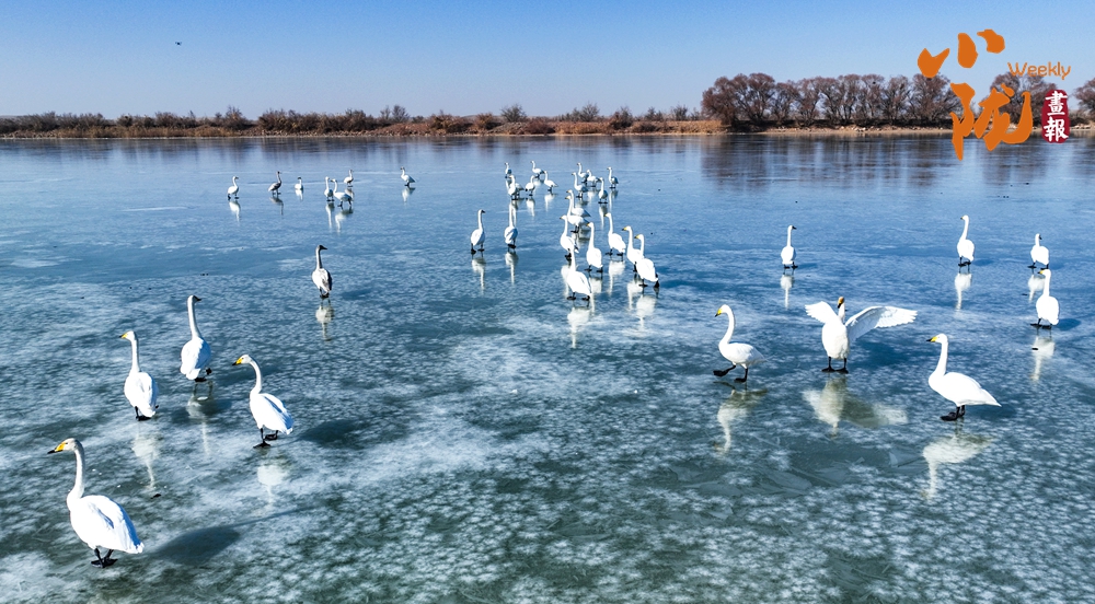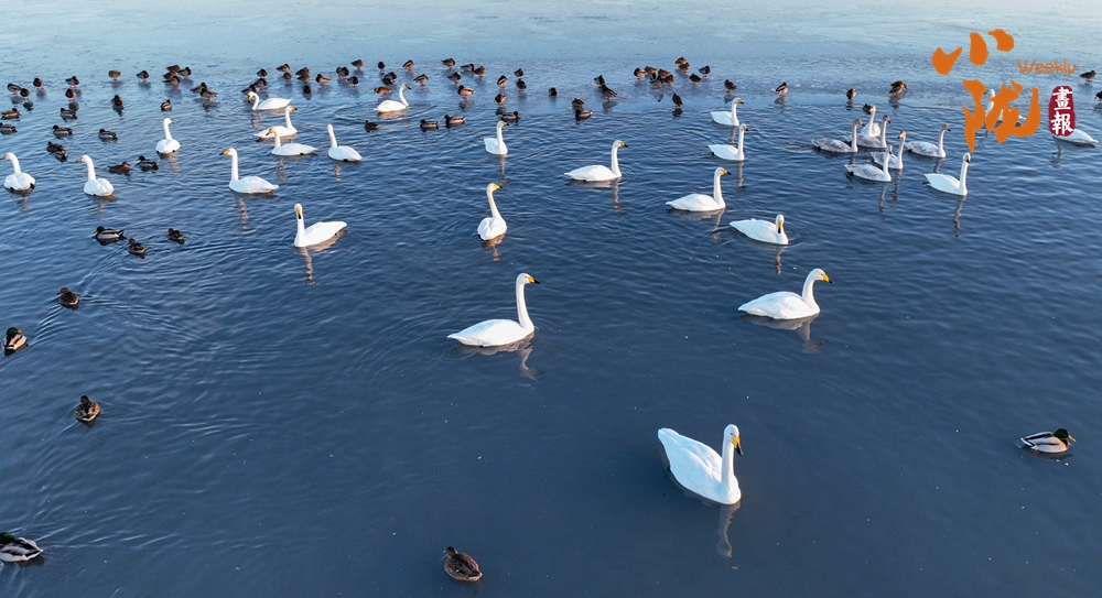 陽光斜照,萬物生暖。水面上,成群的白天鵝不緊不慢地游著,雪白的身影倒映水中,隨著微波輕輕蕩漾,像是一幅流動的水墨畫,素雅而安寧。
