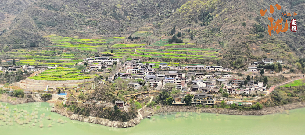 那一叢叢、一簇簇的油菜花,沿著梯田層層疊疊,從江邊一直蔓延到半山腰,鋪展在青山碧水之間;又像是大地剛剛蘇醒時(shí),打翻的調(diào)色盤。